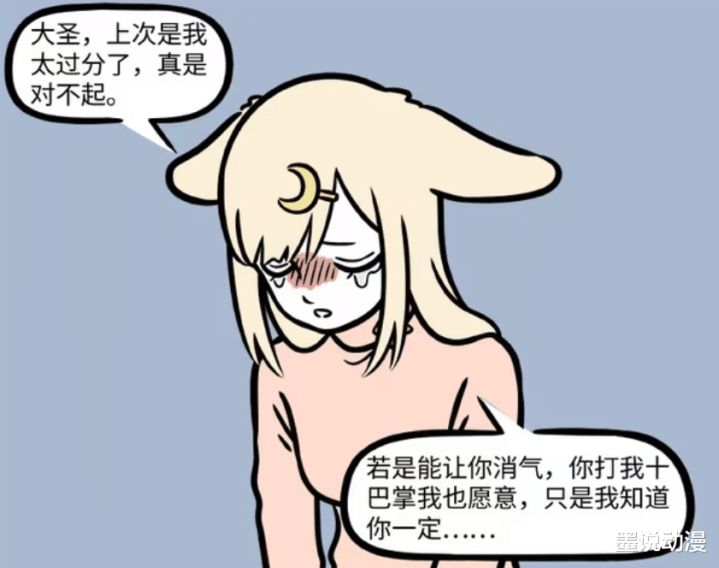 玉兔精第一个去谈歉的东谈主,便是孙悟空。在上一话中,她但是打了孙悟空一巴掌,只不外是她受伤。玉兔精含着眼泪跟孙悟空谈歉,这格调是额外淳厚。玉兔精还示意,唯有好像让孙悟空消气,哪怕是被打十巴掌王人振奋。原来玉兔精还思着,孙悟空细则下不去手。
