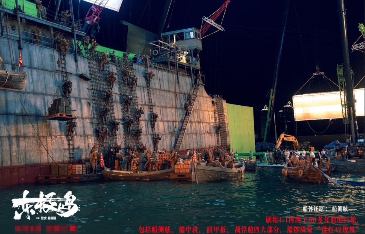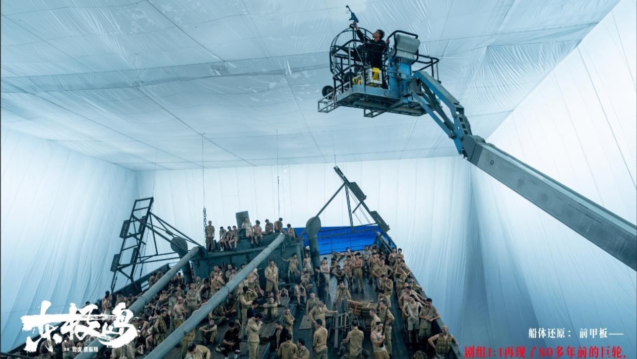 剧组依照战时图纸,在亚洲最大的水棚内1:1复刻了9000平米的日军货轮。