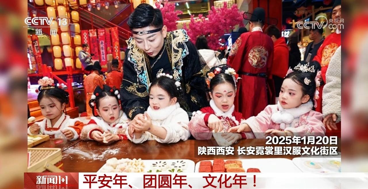 在西安,长安霓裳里汉服文化街区里,小一又友们身着汉服,包饺子、作念糕点,体验非遗文化。