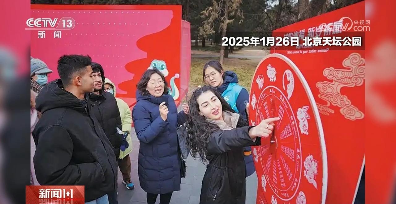 在北京天坛公园,一位异邦旅客正在十二生肖转盘上找我方的属相。