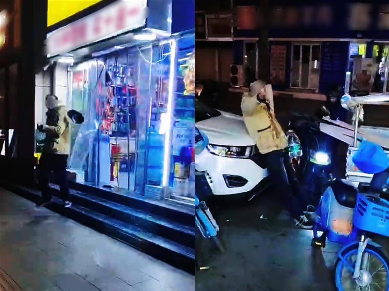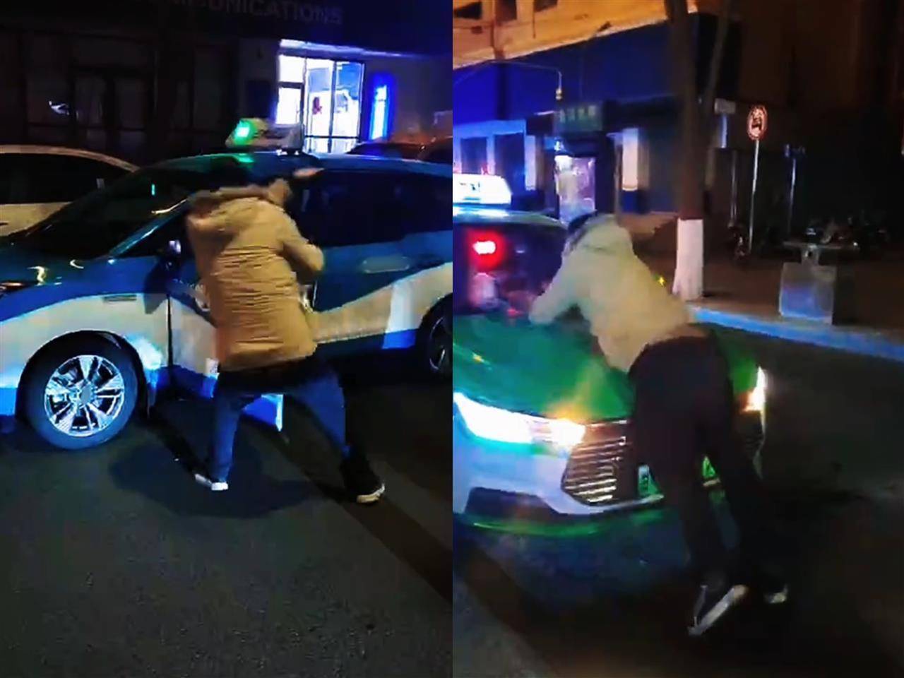 一段2分多钟的视频自满,须眉拍打一辆白色网约车后徒手掰一辆蓝色出租车车门,盛开一辆黄色出租车车门后又挡住一辆绿色出租车,趴在引擎盖上拍打。须眉还从便利店拿走一小桶瓶装水,躺在车前喝水,伙计无奈追出来盘考。