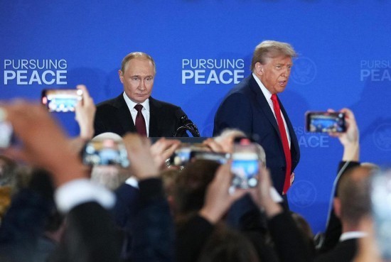 2025年8月15日,好意思国总统特朗普(后右)与俄罗斯总统普京(后左)在好意思国阿拉斯加州安克雷奇市埃尔门多夫-理查森调和军事基地举行会晤后共同出席调和记者会。新华社记者吴晓凌摄