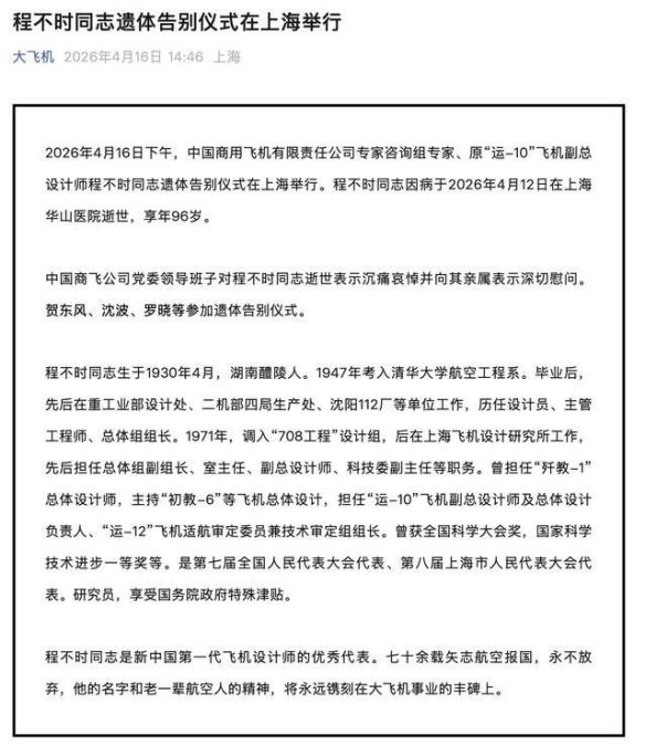 程往往先生的离去之是以让我感到超越千里重,不单是因为中国失去了一位将一世献给故国航空作事的特出飞机设计师,更因为时期正在一个个送别那些曾在一穷二白的年代亲手奠基中国航空工业的亲历者。