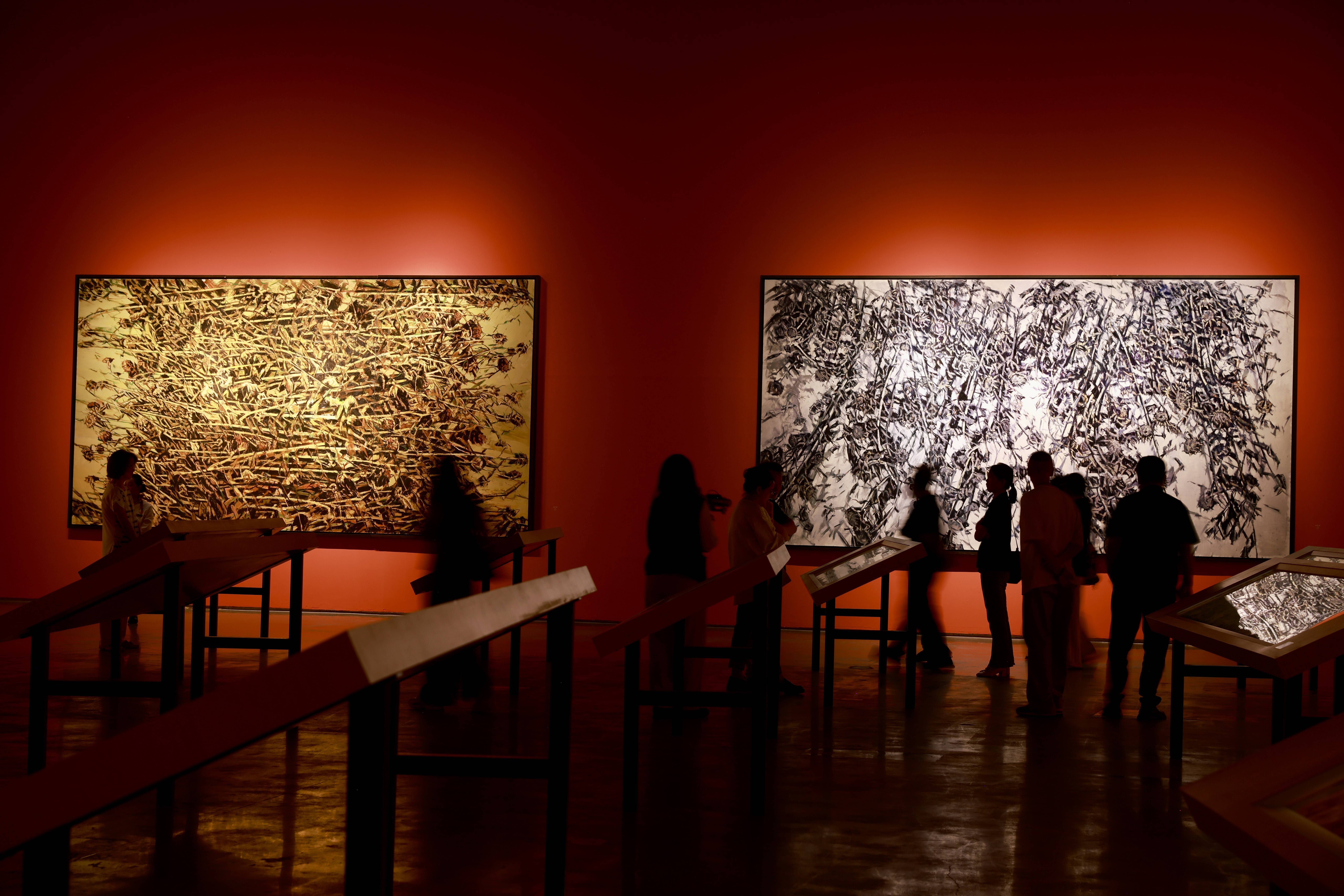 宁波好意思术馆内保留原有候船大厅的空间口头,采纳“铜铁椽木”等具有地域特质的材料。(中国好意思术学院供图)《仰山——许江艺术展》于9月29日至12月3日在这里举办。许江以“俯仰之间、钢铁之间、铿锵之间”来抽象艺术展中呈现的艺术与建筑的对话。1600根铜铸铁浇的葵与莲激昂挺立如箭,红光透射,光影之间,似有熔炉在点燃,锤声转机展厅,邻近锈迹斑驳的铁墙上,12米长、3米高的油画绘出如战士行进般的葵阵,透出雄健的英英气。