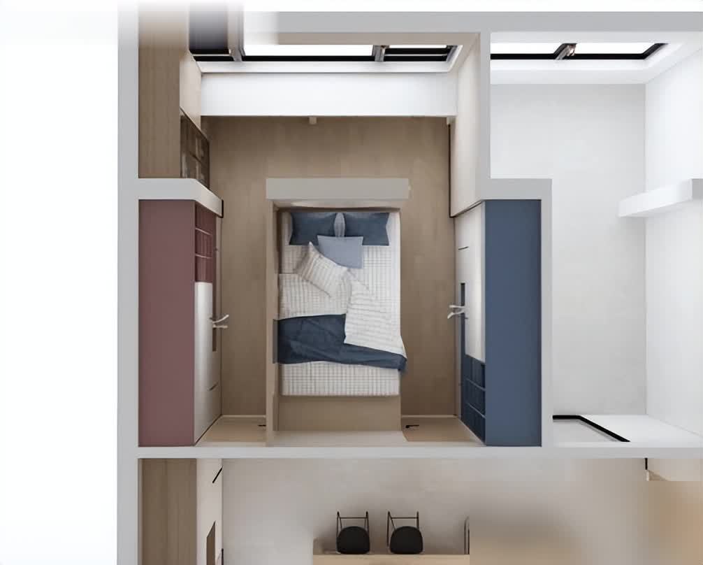儿童房的纠正最戳刚需家庭——把阳台划进去扩大空间,作念个S形错层分男女宝的房间,双方各开一扇门,孩子有我方的小天下,顶头装艺术玻璃,白日毋庸开灯也明亮堂的,不会闷得慌。
