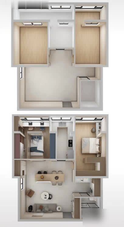 其实小两居改三居,不是“硬塞”房间,是把每一寸空间都用到“活命的痛点上”——卫生间安适换来了双台盆和洗烘解放,矮墙分隔出了餐厅和客厅的功能,儿童房的错层兼顾了阴私和采光。刚需房住得心仪,从来不是屋子有多大,是有莫得把“日子”装进空间里。