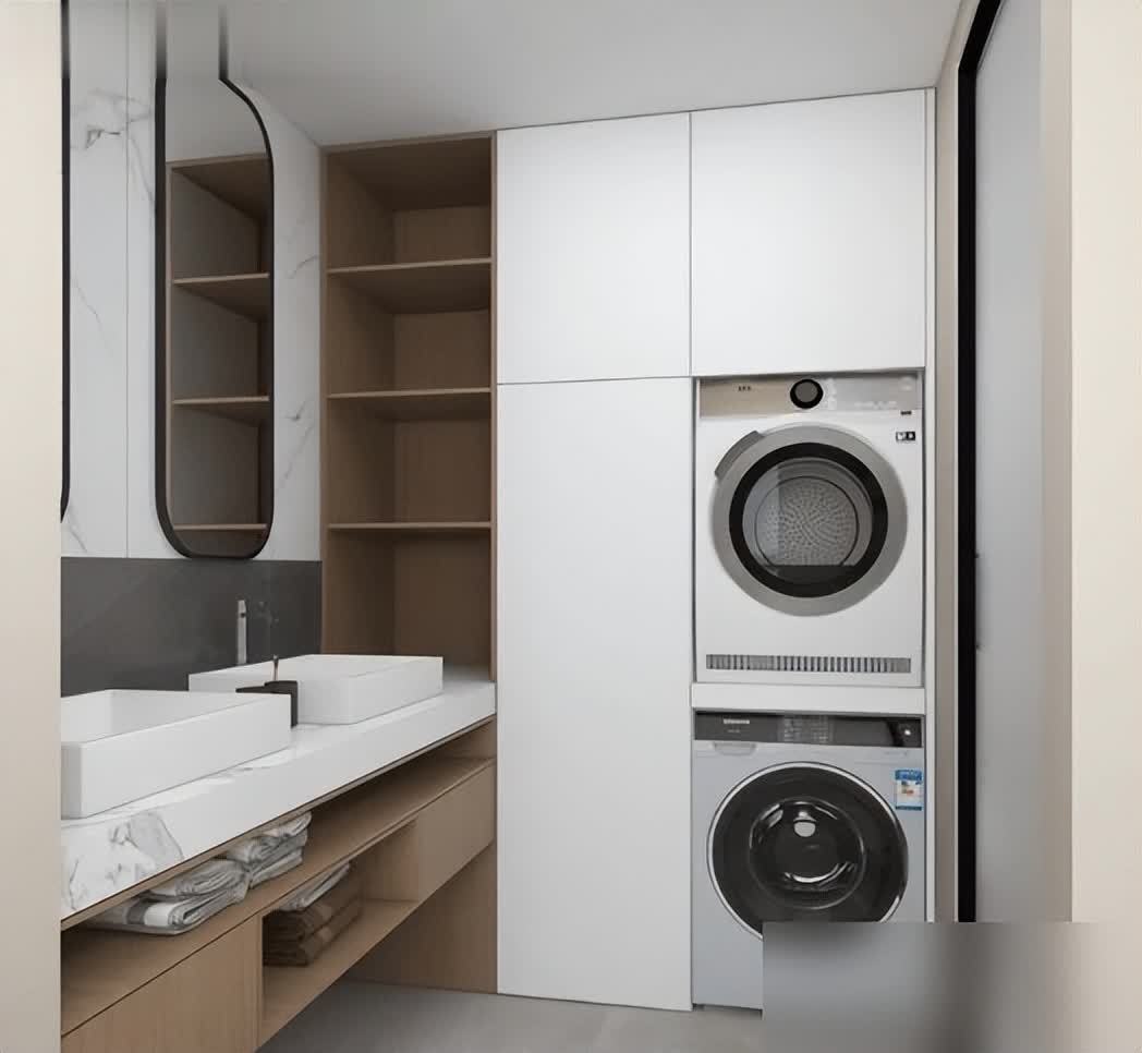 比如卫生间,本来就不大,略略缩少量作念干湿别离,双台盆浴室柜简直能措置早上“抢洗漱台”的矛盾,大东谈主刷着牙,孩子能在傍边洗脸,洗完回身就能用嵌在高柜里的洗烘套装,毋庸把洗衣机堆在阳台占晒穿戴的位置,是不是比蓝本挤在卫生间里搓袜子更顺?